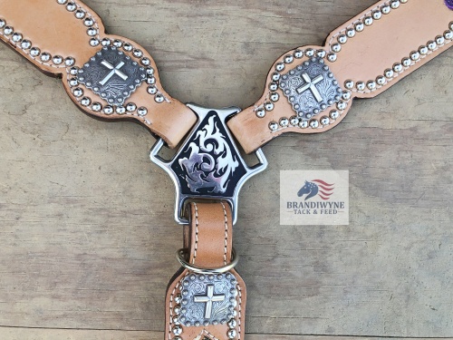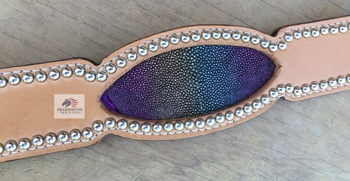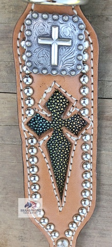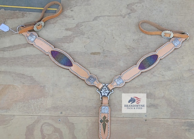Custom made Wind River Tack light oil breast collar w/ rainbow stingray inlay. Cross conchos and cowboy spots. Made w/ Hermann Oak leather.