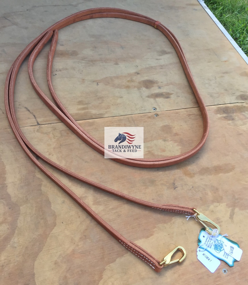 Harness leather split rein. Brass snap ends. 5/8" X 8'. Made in America from the finest Hermann Oak harness leather. The quality is incredible.