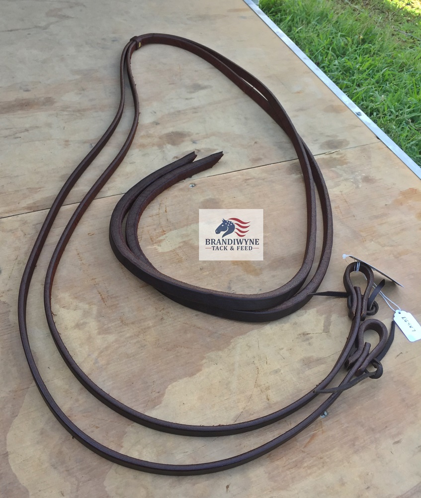 Heavy/dark oil split rein. Waterloop ends. 5/8" X 8'. The quality is incredible. Made in America.