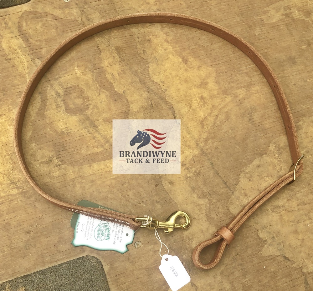 Harness leather tiedown strap. 3/4" X 40". Brass hardware. Conway buckle for adjustment. Made in America with the finest Hermann Oak harness leather. The quality is incredible.