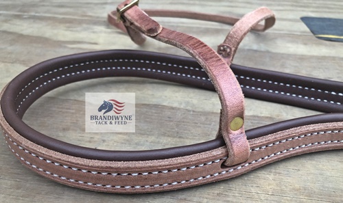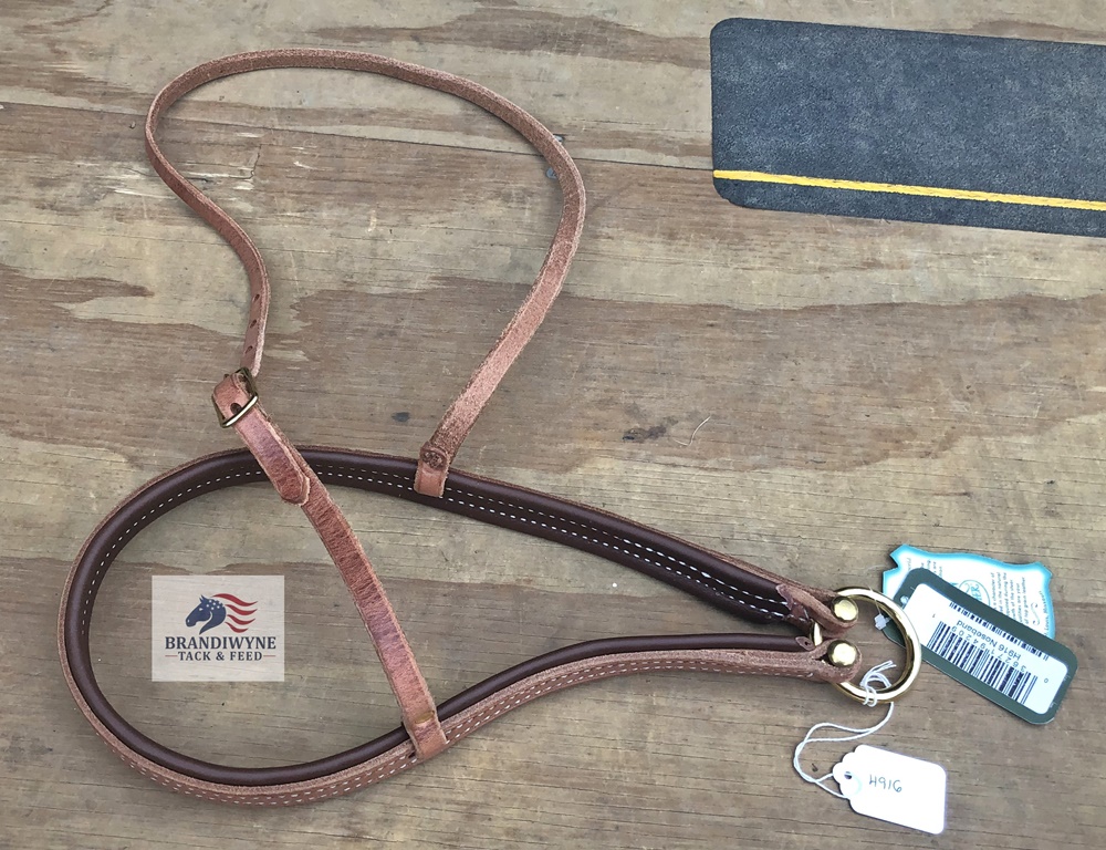 Harness leather tiedown noseband. Solid brass hardware. Burnished edges. Put together with halter bolts instead of rivets for a better fit. Soft oil tan liner for comfort. Made in America from the finest Hermann Oak harness leather. The quality is incredible.