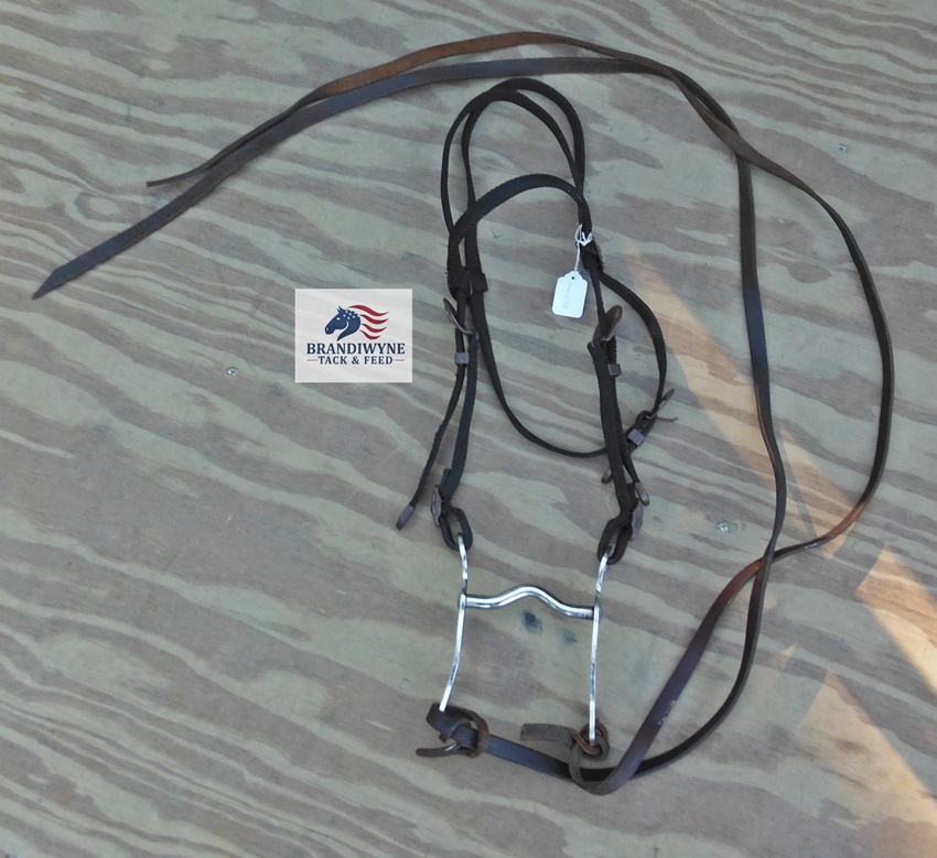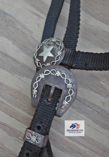 Used black nylon browband headstall. Antique buckles and conchos with barbwire and stars. Grazing bit shows some rust. The reins do no match. They have been modified to tie on. One of them is marked Circle Y.