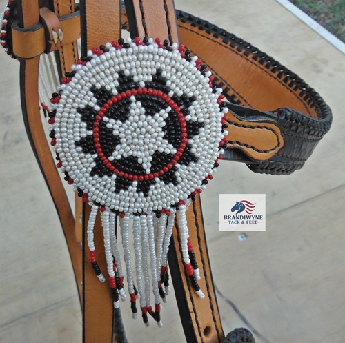 Beaded medallion headstall with black gator overlay. Native American beading. Missing one Chicago screw at the buckle. New with tags. Retails for $184.