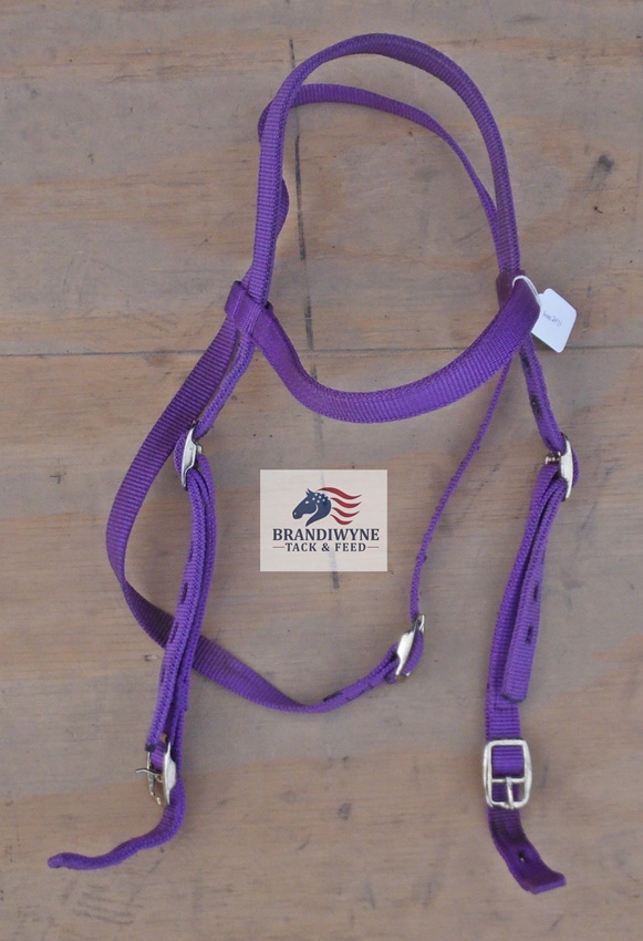 Used purple nylon browband headstall. Average horse size. Brass tone hardware. Quick change buckle bit ends. Ready to use.