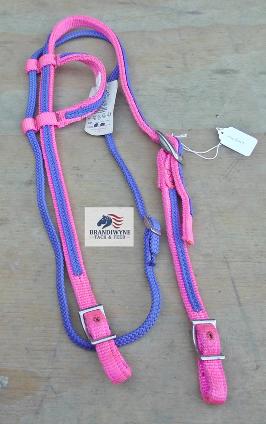 Tuffy brand neon pink nylon one-ear headstall with purple or royal blue braided nylon overlay and throat latch. It looks purple in some light and royal blue in others. New with tags but dirty from display. Average horse size.