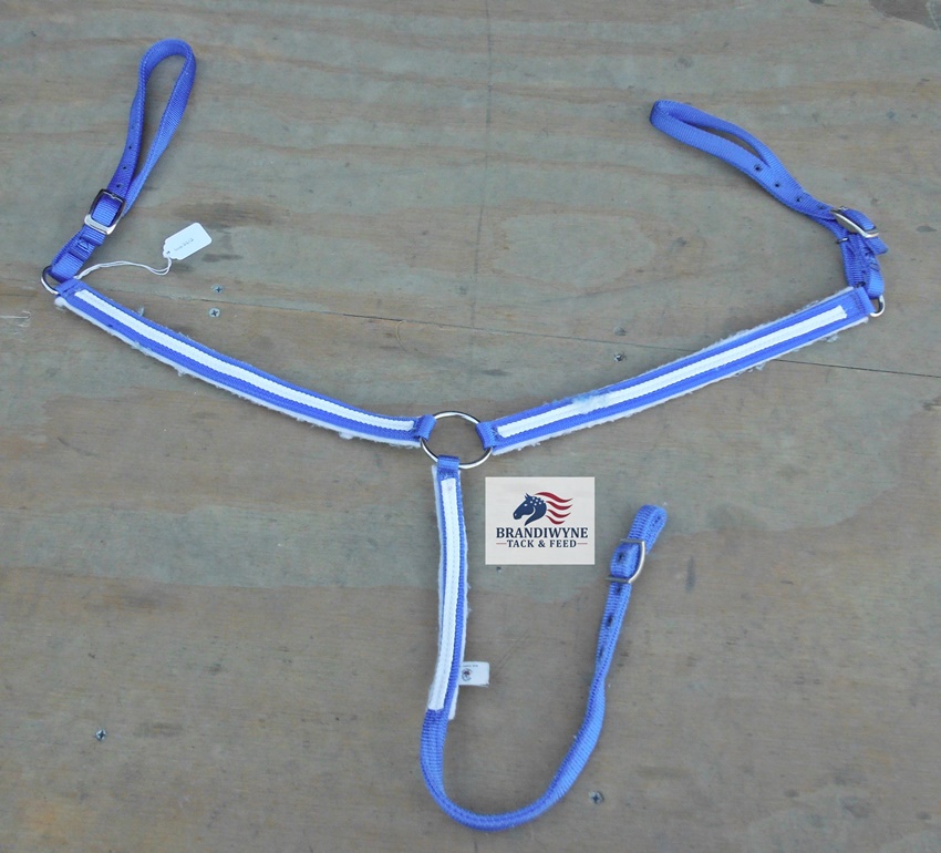 Tuffy brand blue nylon breast collar with white nylon braided overlay. White felt backing. Doesn't look like it's been used but has been stored quite a while so the hardware shows some corrosion. Overlay on the left side has some minor damage...looks like maybe it hung on a piece of Velcro or something similar.