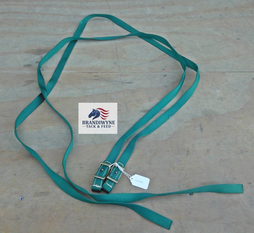 Green nylon split reins with brass Conway buckles. Unsure if they've been used but they do have a couple of places that look like mice may have chewed on them a bit. 3/4" X 74". They have been washed and are usable as is.