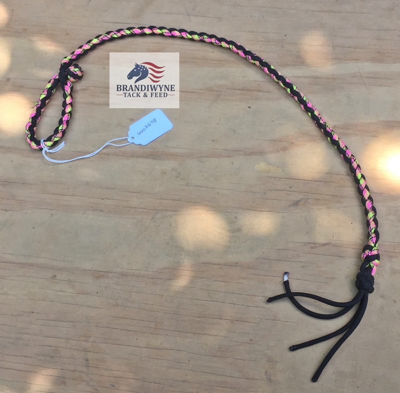 Handmade quirt with wrist loop and nylon popper. Black with neon pink & neon yellow. 28" overall length. Approx. 1/2" wide.