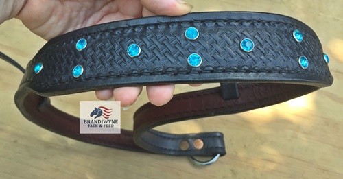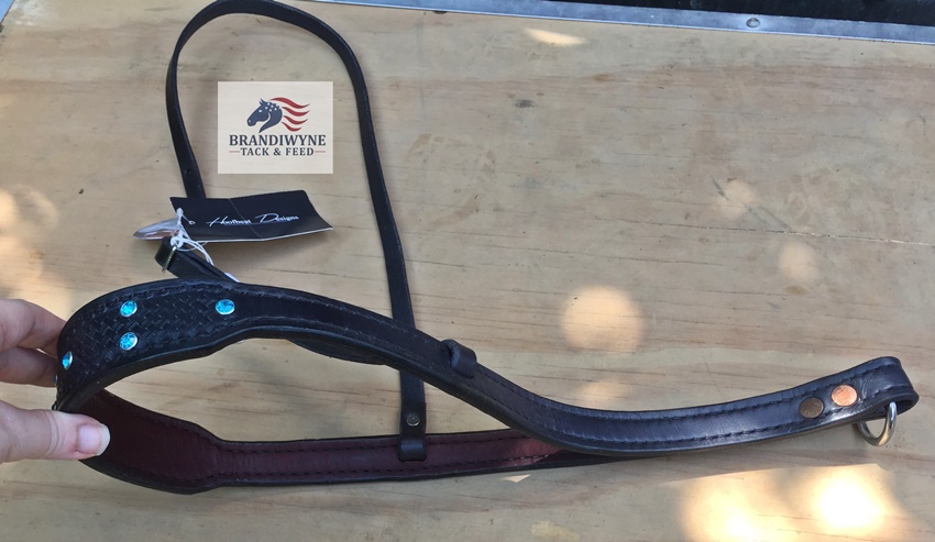 Custom handmade leather horse sized tiedown noseband. Black leather with hand stamped basketweave and turquoise rivets. Hand stitched and smooth black edges. Smooth leather lined. One of a kind. 100% American made by hand with American leather.