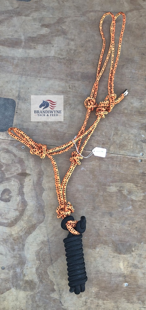 Orange & black nylon rope halter with black lead. Average horse size. New without tags, but the halter shows some fading from display. Otherwise perfect shape and ready to use.