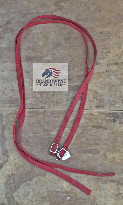 Used red nylon split reins. Buckle bit ends. 3/4" X 6 1/2'. Overall good condition.