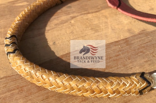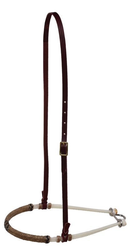 Double rope with braided rawhide nose and latigo poll strap tiedown noseband. Tiedown not included.